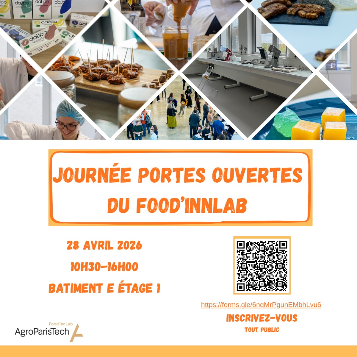 Le Food’InnLab d’AgroParisTech organise sa journée portes ouvertes le 28 avril 2026 de 10h30 à 16h00 sur le campus Agro Paris-Saclay (Palaiseau) au bâtiment E étage 1.
